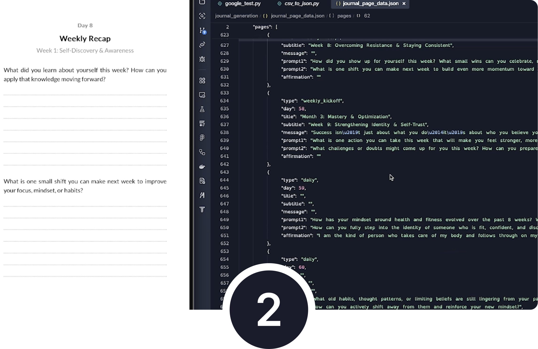 Our system analyzes your goals and generates a physical, one of a kind journal full of prompts designed to help you turn your goals into accomplishments.
